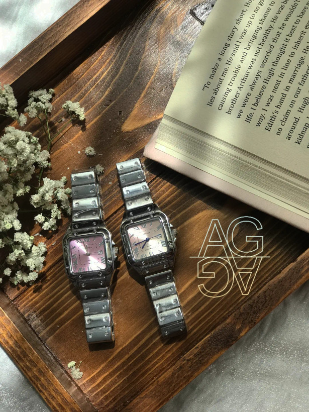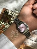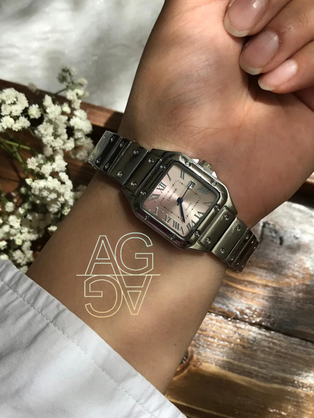 ساعت کارتیر با اعداد رومی رنگ بندی صفحه: صورتی پودری و صورتی باربی دارای تاریخ روز شمار رنگ بدنه و بند، ثابت و استیل ضد حساسیت.