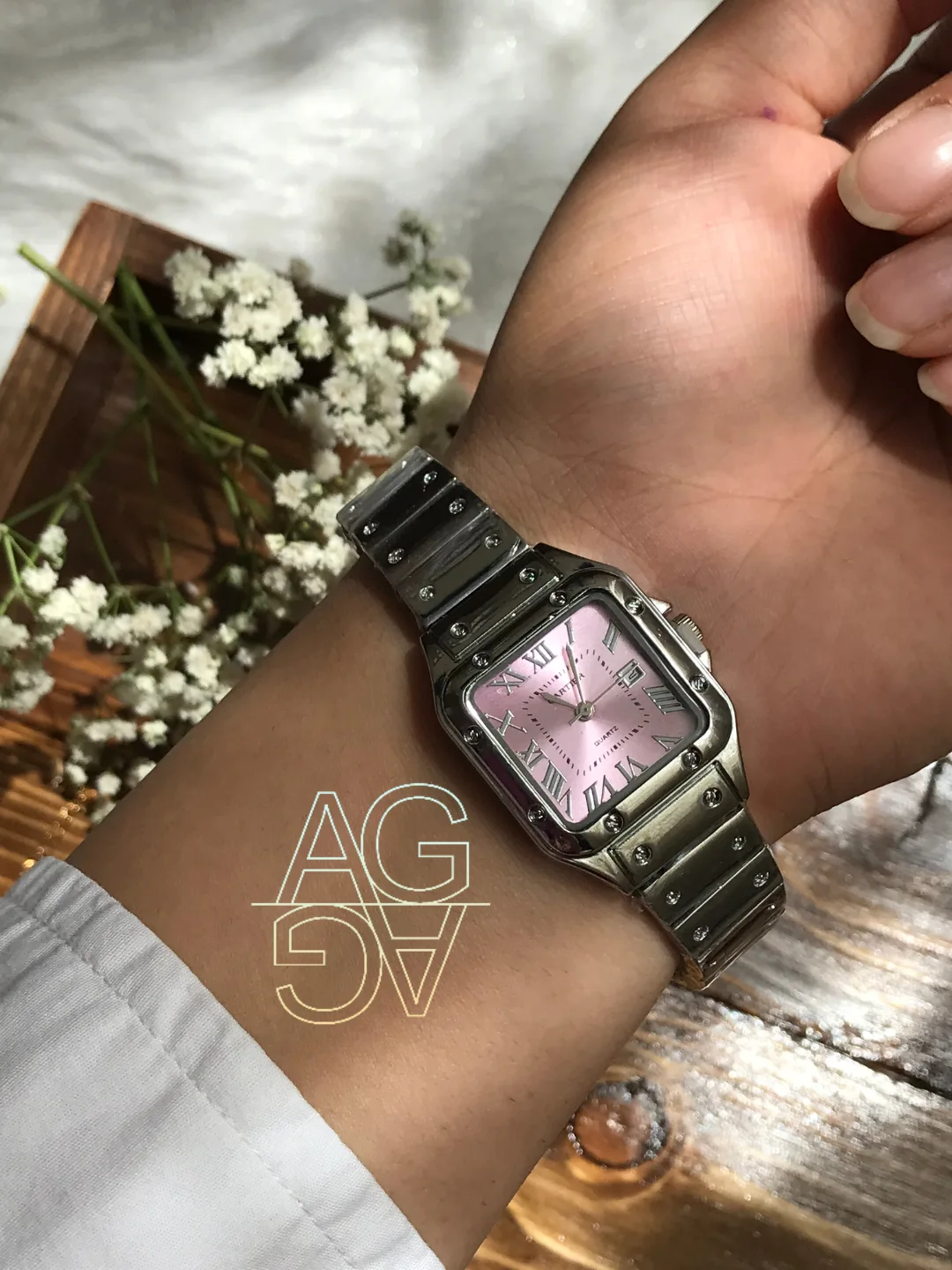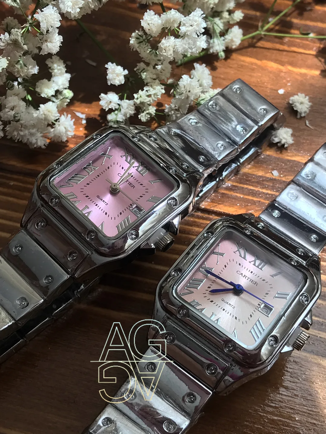 ساعت کارتیر با اعداد رومی رنگ بندی صفحه: صورتی پودری و صورتی باربی دارای تاریخ روز شمار رنگ بدنه و بند، ثابت و استیل ضد حساسیت.